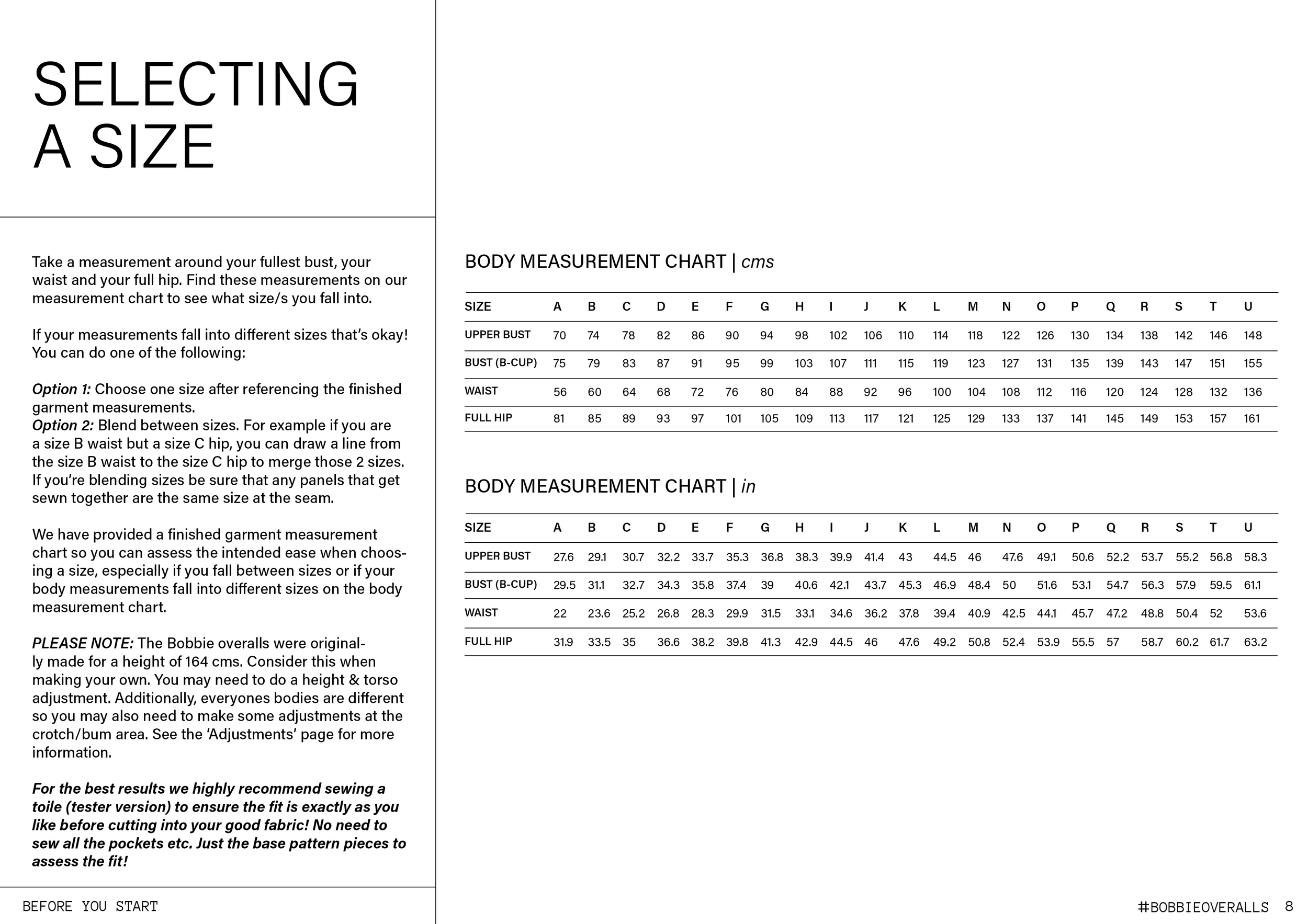 PLEASE NOTE: The Bobbie overalls were originally made for a height of 164 cms. Consider this when making your own. You may need to do a height & torso adjustment. Additionally, everyones bodies are different so you may also need to make some adjustments at the crotch/bum area. See the ‘Adjustments’ page of the instructions for more information.