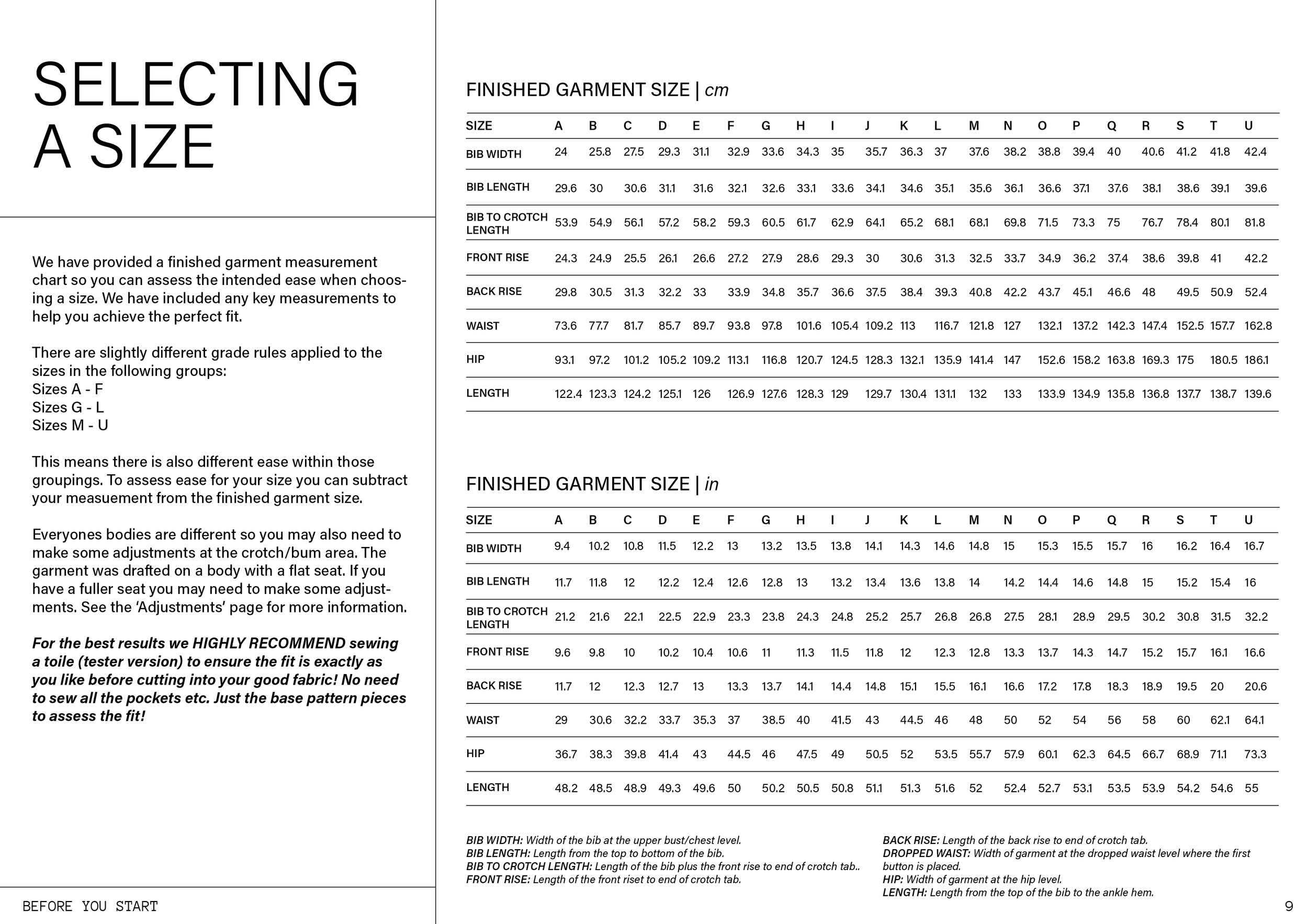 We have provided a finished garment measurement chart with many different measurements so you can assess the intended ease when choosing a size, especially if you fall between sizes or if your body measurements fall into different sizes on the body measurement chart.